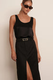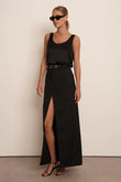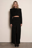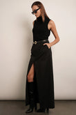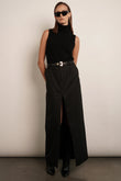 The Anna Maxi Skirt is crafted with a mid weight suiting fabric. It comes in maxi length with side seam pockets, back illusion welt pockets, and a high front slit with belt loops. It has a zip fly with a hook and bar closure and is unlined. Low Rise Fit.