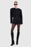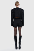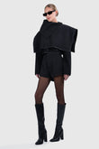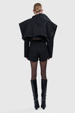 The Lea Cape Jacket reimagines outerwear with an architectural edge. Cut in a wool blend, this cropped silhouette features an overlapping cape design trimmed in sleek black binding for definition. A sculptural collar frames the neckline, while the layered construction brings volume and movement. Underneath, a tailored cropped jacket fastens with front buttons, adding function to form.