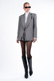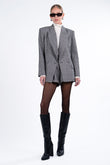Solene Blazer- a study in relaxed tailoring, the Solene Blazer is cut from a gray herringbone fabric with a softly structured, slightly oversized fit. Finished with front buttons and classic lapels, it pairs effortlessly with the Laurette Shorts for a modern, understated set that moves seamlessly from day to night.
