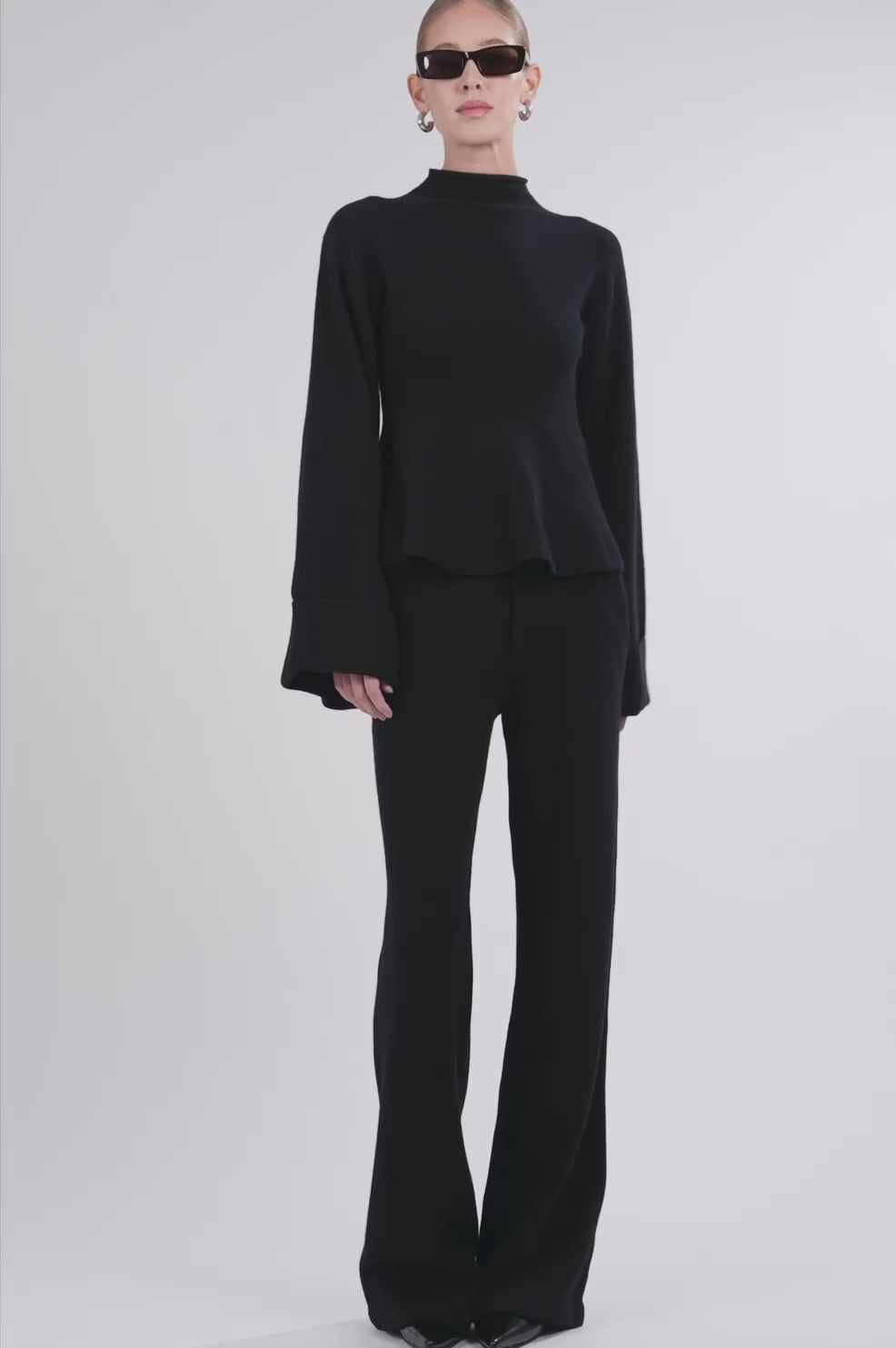 The Adeline Knitted Peplum Top is crafted from 100% wool and is designed to enhance your silhouette. This turtleneck features shoulder pads and box pleated darts that cinch the waist and drapes into a peplum hem. Pair this style with our knitted Beatrice Pants for a coordinated look.