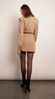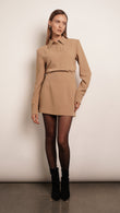 Look stylish and feel confident in the Stephanie dress. Crafted from a crepe fabric and featuring a buttoned collar and polo snaps, this piece is designed with padded strong shoulders and a darted waist to flatter your figure. Look and feel your best in this dress.