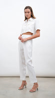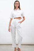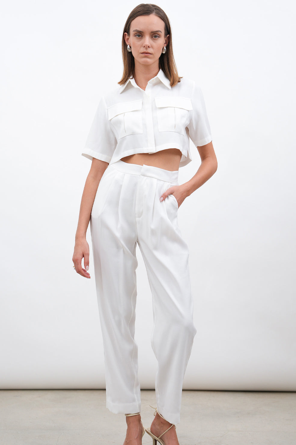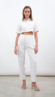 The Valeria Crop Top is cut from soft linen with a clean, cropped silhouette. Finished with a sharp point collar, button-front closure, and utility-inspired chest pockets, it balances structure and ease in a piece designed for everyday rotation.