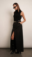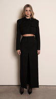 The Anna Maxi Skirt is crafted with a mid weight suiting fabric. It comes in maxi length with side seam pockets, back illusion welt pockets, and a high front slit with belt loops. It has a zip fly with a hook and bar closure and is unlined. Low Rise Fit.
