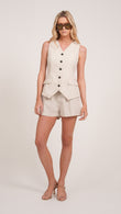 Indulge in the effortless elegance of our Margot Linen Vest. Made from high-quality linen, this versatile piece is perfect for spring and summer. Pair it with our Esme Linen Shorts to complete the sophisticated set. Enjoy the luxurious comfort and style of this must-have addition to your wardrobe.