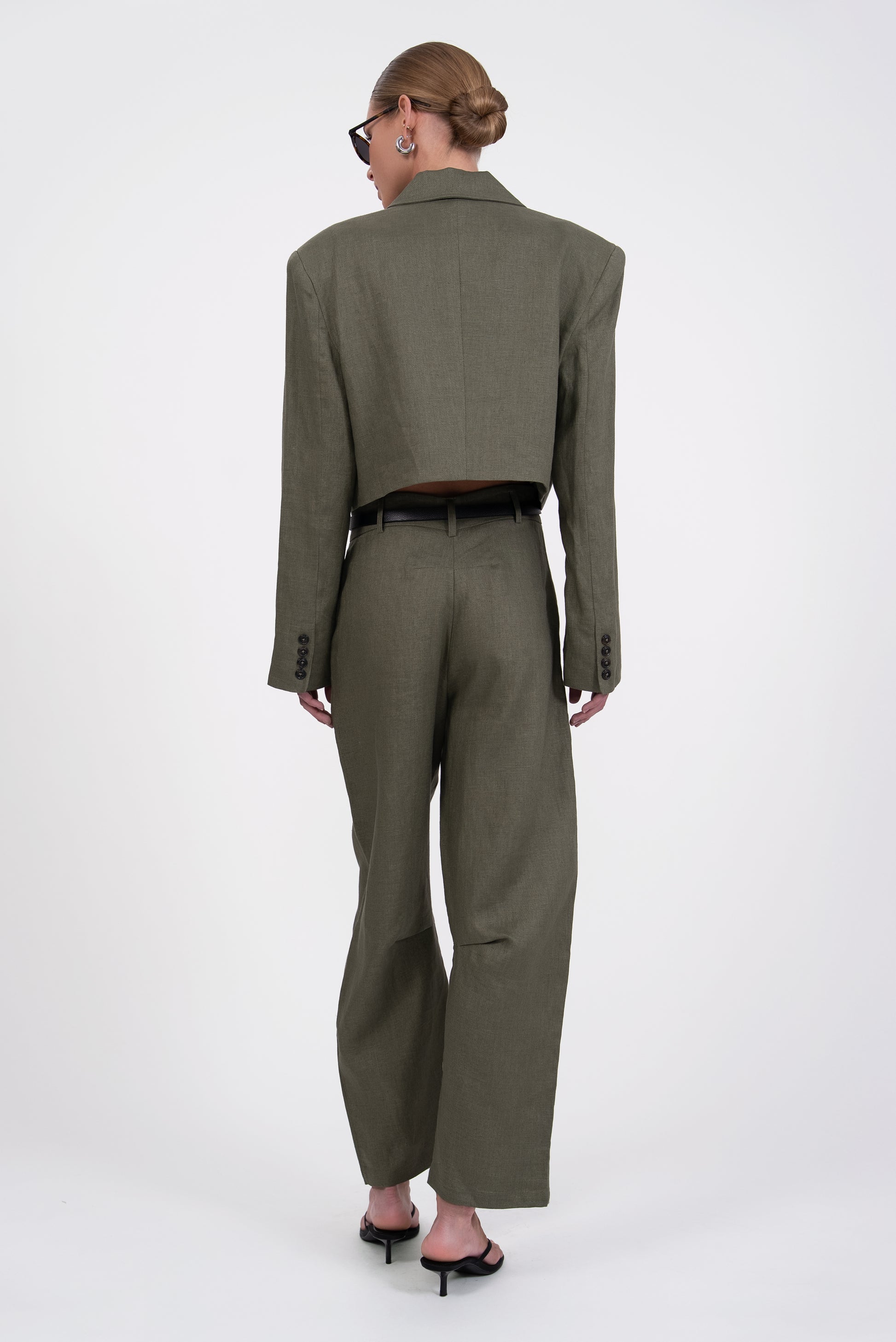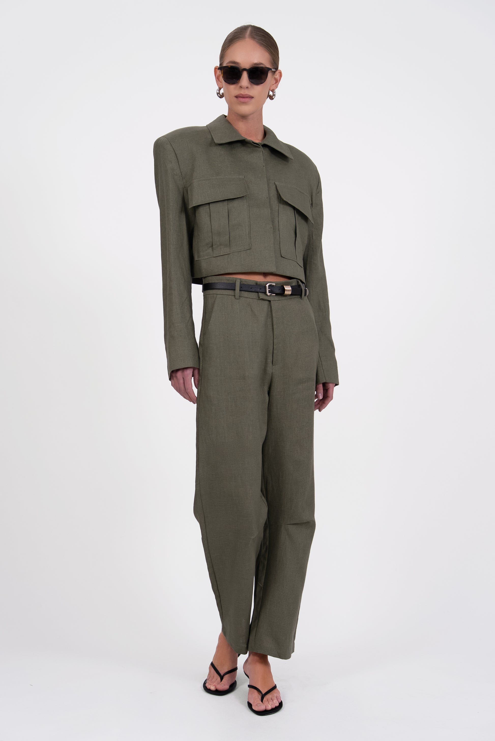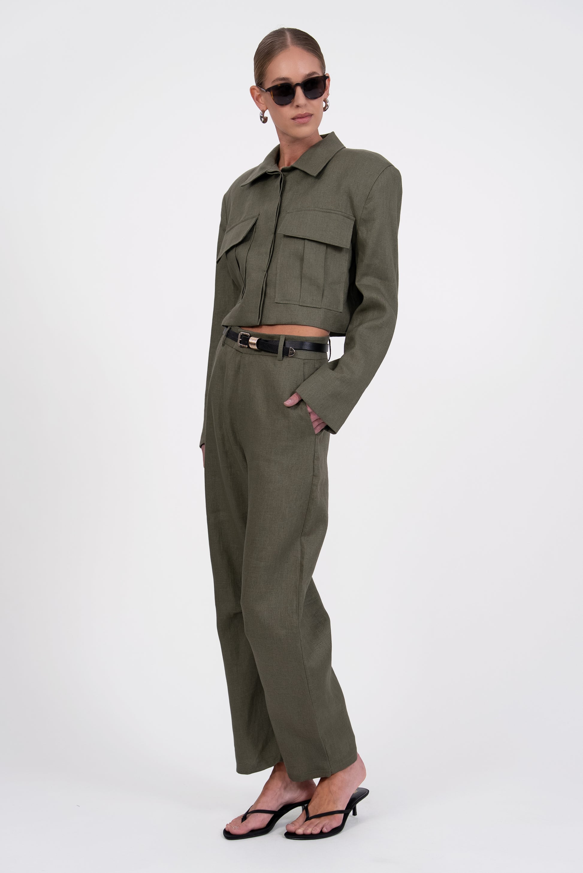 The Clarice Crop Jacket is cut in a structured cropped silhouette for a modern, polished finish. Designed with a sharp pointed collar, oversized flap pockets, and a clean front button closure, it strikes the perfect balance between tailored and effortless. Subtle padded shoulders add shape, while the full lining ensures all-day comfort. Crafted in breathable linen, it’s the layer that pulls everything together — structured, confident, and endlessly wearable.