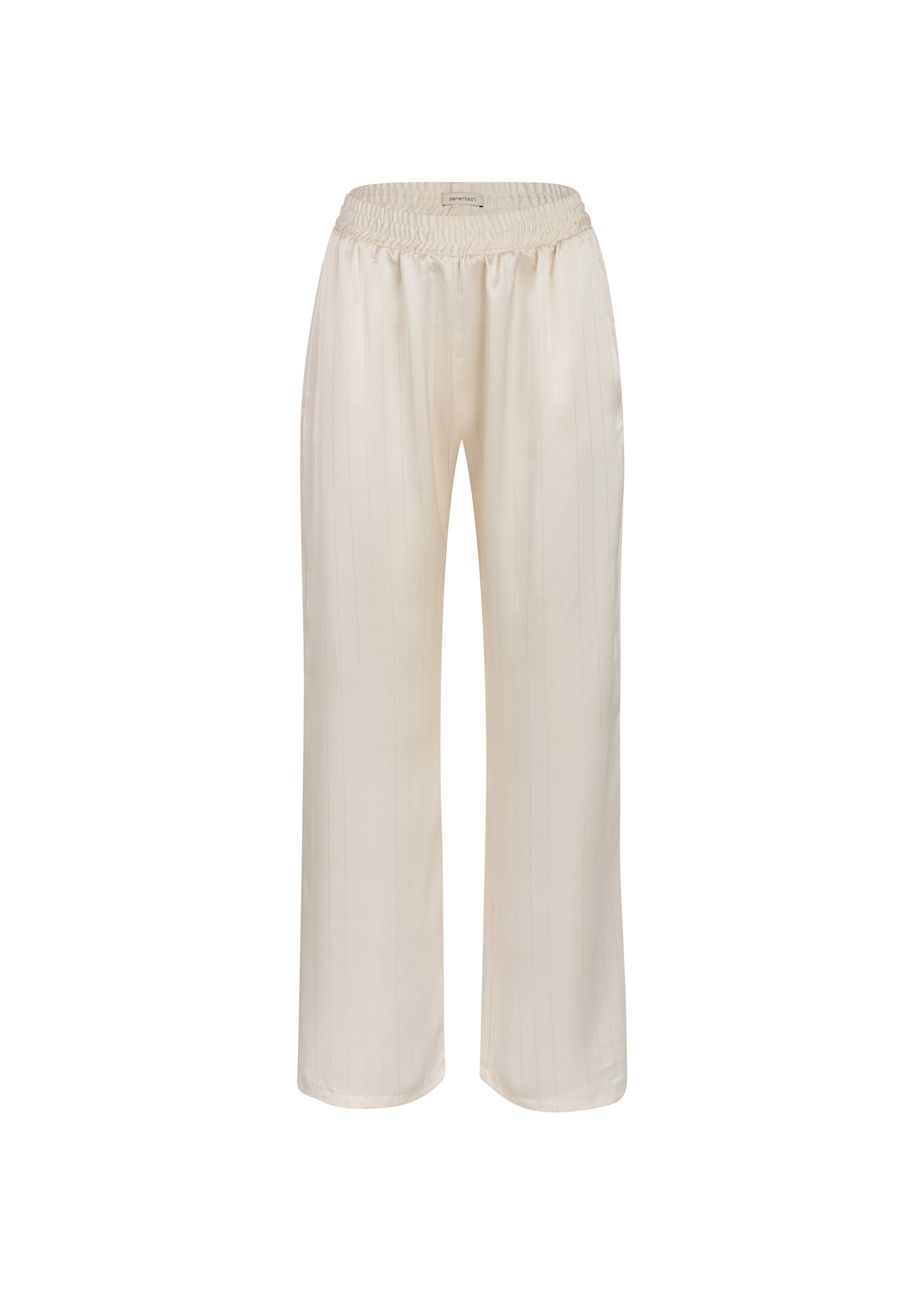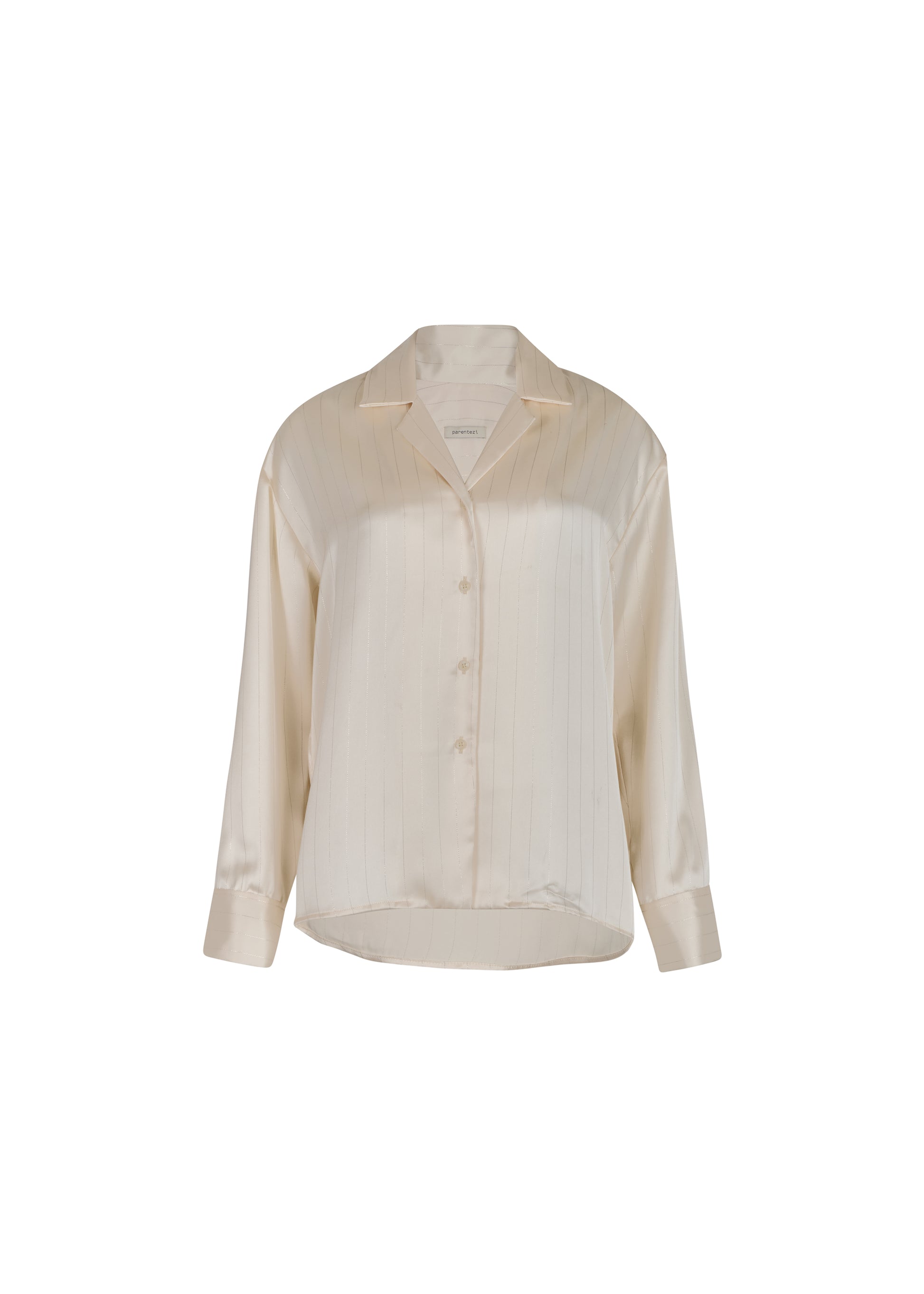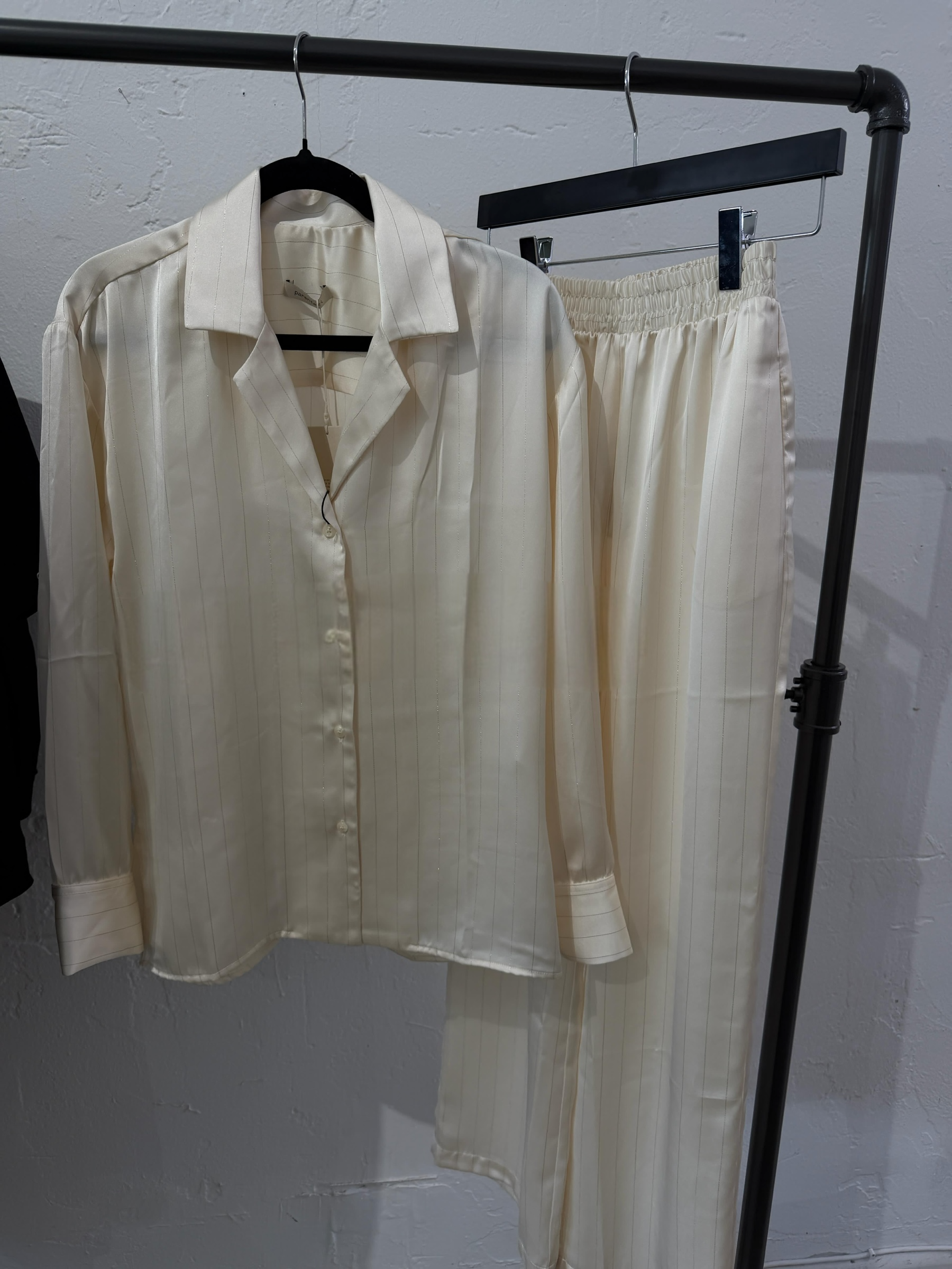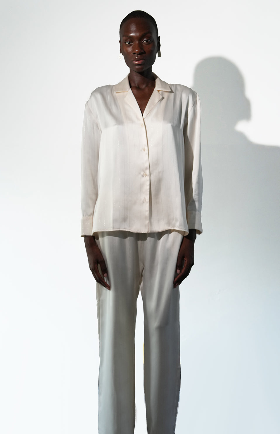 Designed in a soft ivory shimmer pinstripe, the Anouk Top features a relaxed button-down silhouette with long sleeves and a crisp collar. Wear it with the matching pants for an effortless head-to-toe set.