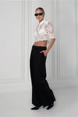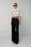 A modern take on classic lace, the Loretta Lace Polo Top is crafted in crisp white floral lace with a sharp collar and button placket, balancing femininity with structure. Slightly cropped with sculpted short sleeves, it pairs effortlessly with tailored bottoms for a refined yet directional look.