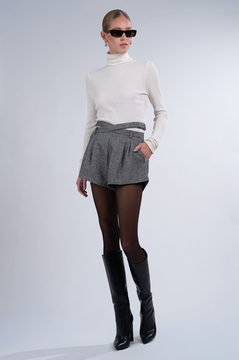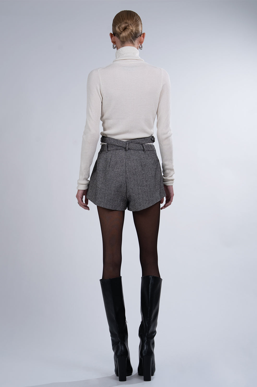 Laurette Shorts- tailored from soft faux wool in a grey herringbone weave, the Laurette Shorts offer a refined take on everyday ease. Designed with side hip buttons and a clean, structured silhouette, they pair perfectly with the Solene Blazer for an effortless matching set.